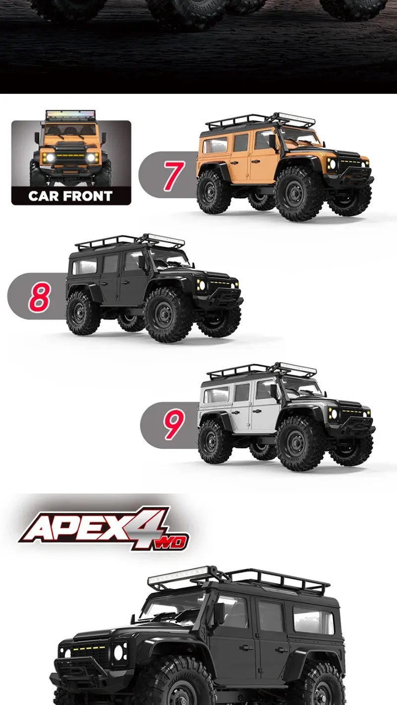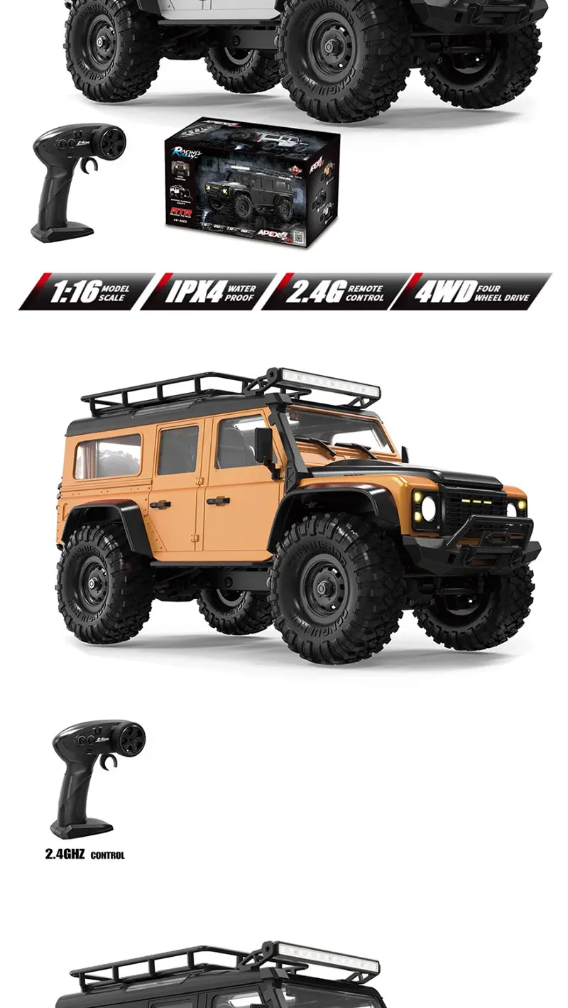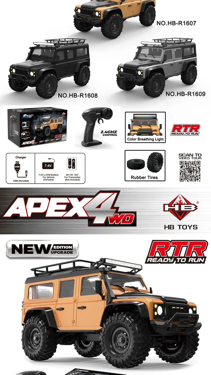 1 DescriptionThe HB Toys 1:16 Scale 4WD RC Car Model: R1604/5/6 offers exceptional off-road capabilities with its robust design, full proportional control, and LED light system. This rock crawler is equipped with a 280 brushed motor, providing ample power for challenging terrains. With a top speed of 10 km/h, it features a four-wheel drive system, independent suspension, and high-precision bearings. Available in multiple colors including army green, this truck offers hours of fun with approximately 25 minutes of playtime per charge. Whether you’re climbing rocks or racing on uneven terrain, this durable RC car is perfect for adventurous RC enthusiasts.2 Specifications* Brand: HB Toys* Model: R1601/2/3/4/5/6/7/8/9* Scale: 1:16* Color Options: as image* Max Speed: 10 km/h* Power System: 280 brushed motor* Transmitter: 2.4GHz, 4 channels* Remote Distance: Up to 35 meters* Battery: 2S Li-ion 500mAh rechargeable battery* Battery Charging Time: Approximately 4 hours* Battery Playing Time: About 25 minutes* Dimensions: * Car Size: 31.5 x 14 x 16 cm * Box Size: 34.2 x 20.5 x 20.8 cm* Material: Plastic, rubber, and electronic parts3 Key Features* LED Lights: Equipped with front and rear LED lights for better visibility during night driving.* Metal Gear Steering Servo: Offers precise control for smooth and stable steering.* Four-Wheel Drive 4WD: Provides excellent traction on various surfaces, making it ideal for off-road adventures.* Independent Suspension: Front and rear independent suspension system for enhanced stability on rough terrains.* High Precision Bearings: Imported bearings throughout the vehicle ensure smooth operation.* Proportional Control: Full proportional control allows for precise adjustments in speed and direction.* Cruise Control: Allows the truck to move steadily without manual throttle adjustment.* Durable Build: Constructed with strong plastic, rubber, and high-quality electronic parts for long-lasting use.* Easy-to-Use Remote Control: 2.4GHz remote provides responsive control and a range of up to 35 meters.* Adjustable Steering Fine-Tuning: Provides precise steering adjustments for optimal handling.4 Ideal For* RC Car Enthusiasts: Perfect for hobbyists who enjoy racing and off-roading with high-performance remote-controlled cars.* Kids Ages 8 and Up: Great for children interested in outdoor activities, offering safe and exciting fun.* Gifts: A great gift for birthdays, holidays, or any special occasion, especially for fans of off-road racing.* Outdoor Adventures: Ideal for use on outdoor terrains such as dirt paths, grass, and gravel roads.* Collectors: Ideal for collectors who appreciate quality craftsmanship and durable off-road RC models.