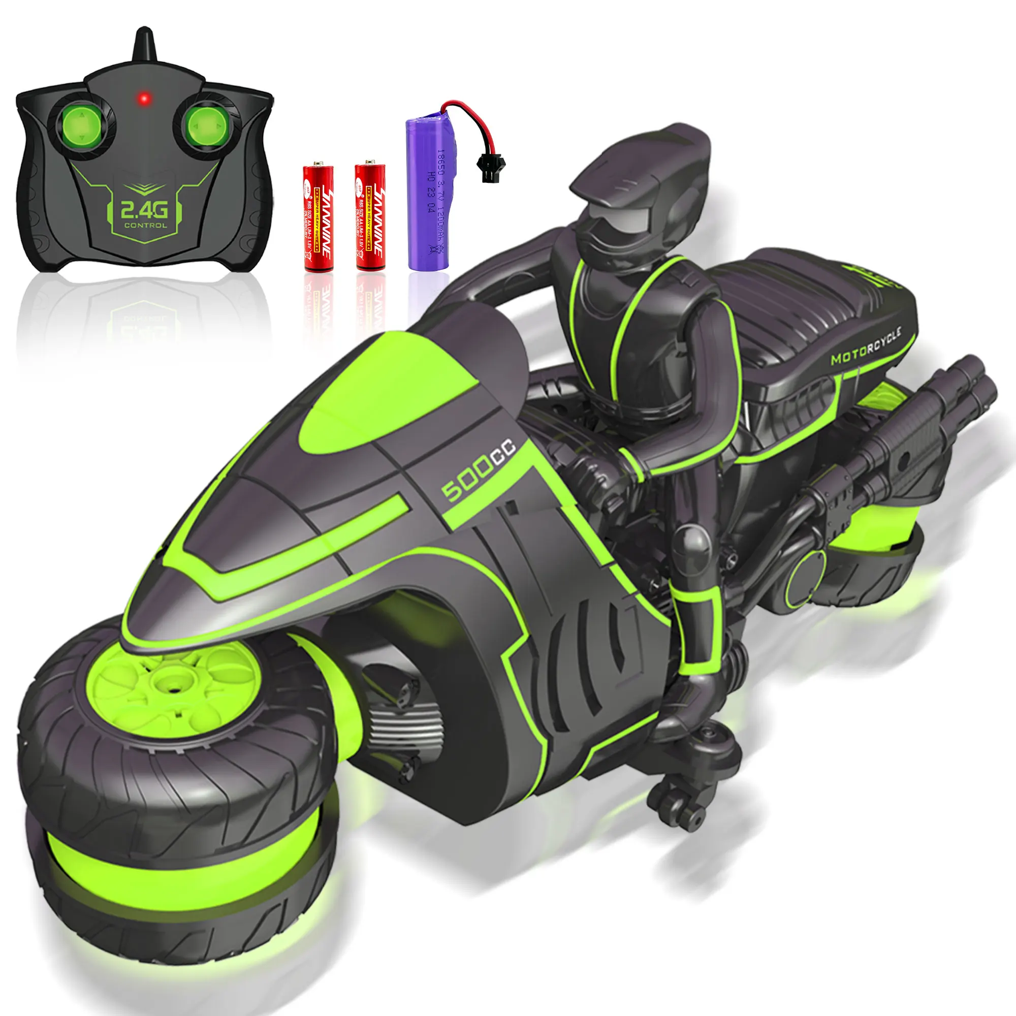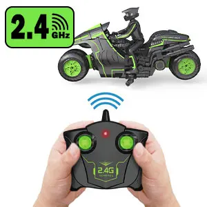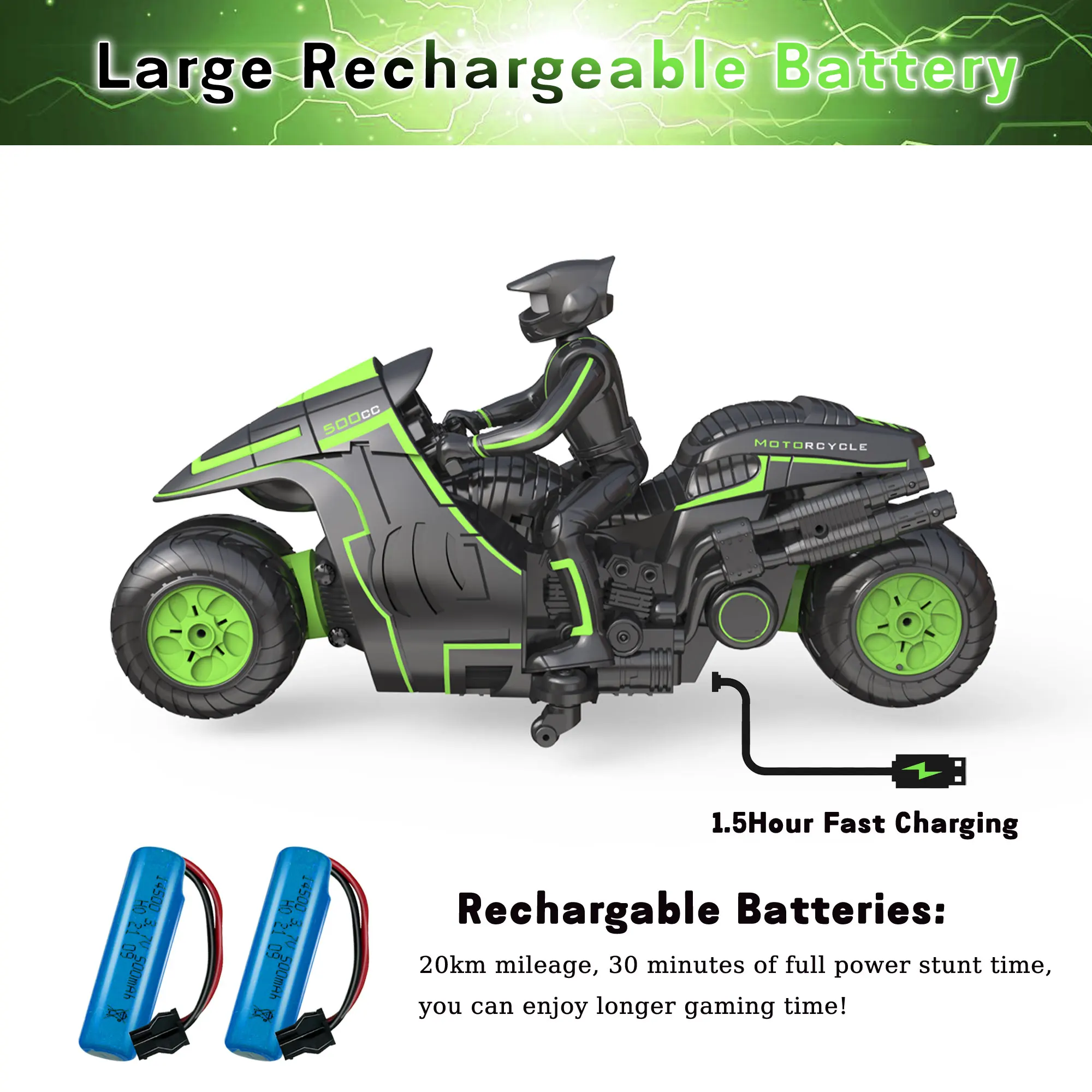 1.The KW 360 Rotating Drift Remote Control Motorcycle is a side-stunt RC car toy designed with 2.4GHz frequency, offering impressive power and a 30 meters remote distance. Load the control battery 7.4V 2400mAh LiPo separately to enjoy an uninterrupted playtime of up to 5-10 minutes.