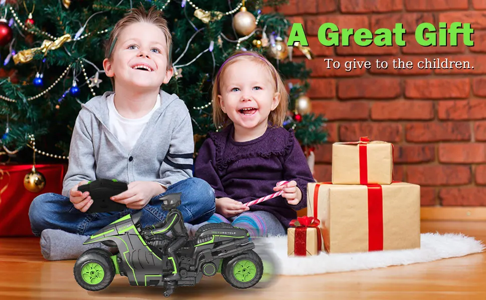 5.The 2.4 Ghz stunt bicycle is a four-wheeled, wild-size motorcycle made of sturdy ABS and PP material. It can be taken as a children’s new toy, suitable for all boys and girls aged 6-12 years old, which can create all kinds of magic at home and in parks, forests, and desert sites.