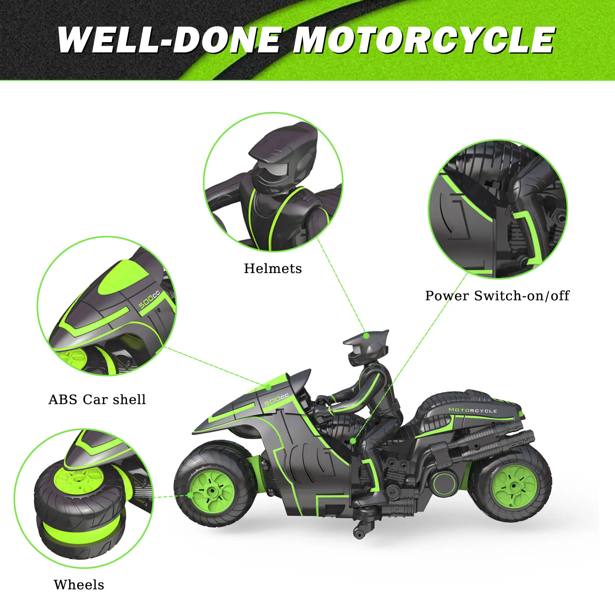 3.The remote control Stunt Motorcycle is designed with a robust and high-grade die-cast metal frame. With 134g heavy motorcycle, it can guarantee high-speed moving. It supports drifting, sensitive 2.4GHz frequency technology, and stronger signal reception to stabilize the remote control connection, making it a perfect choice for both indoor and outdoor play.