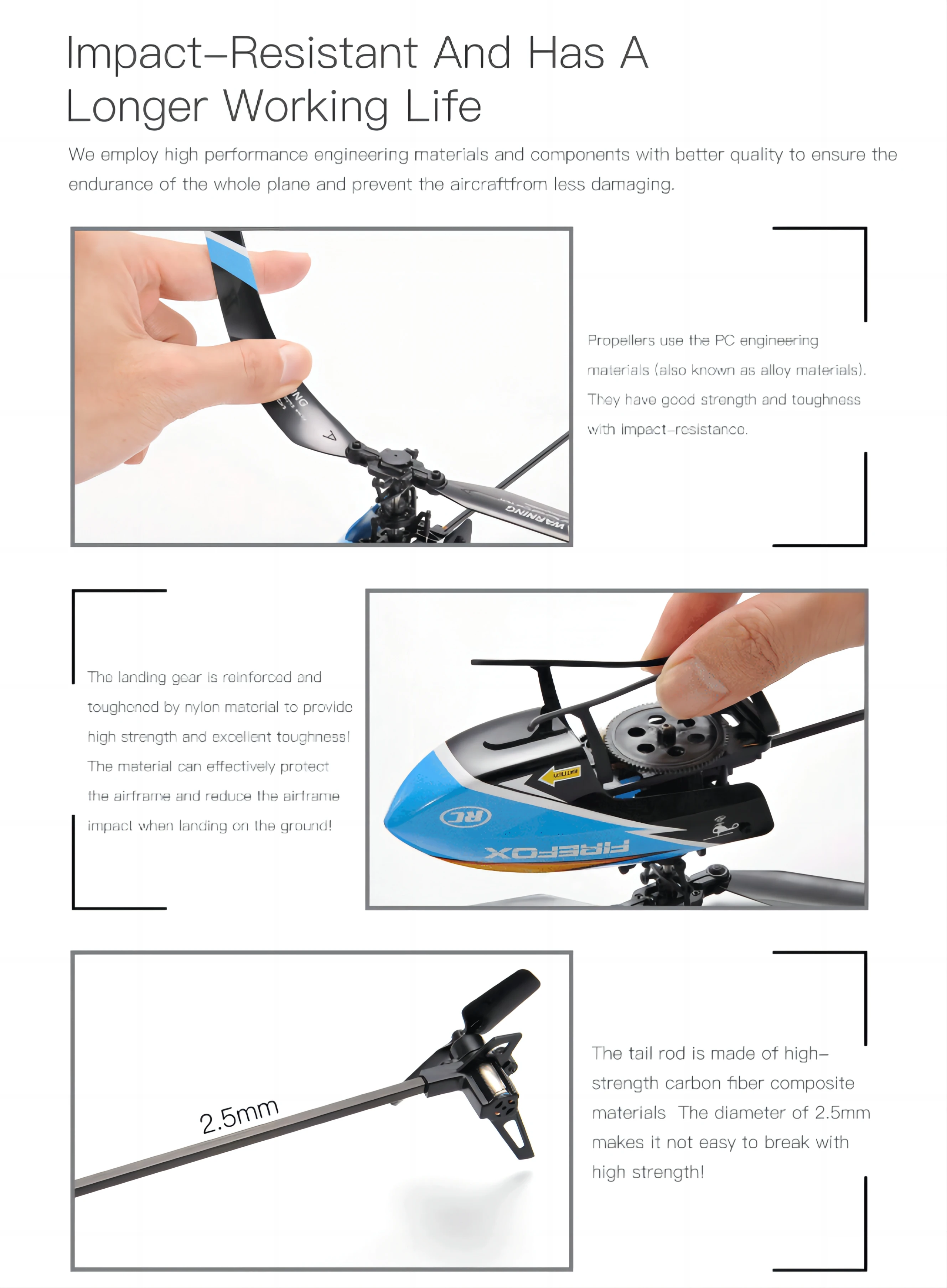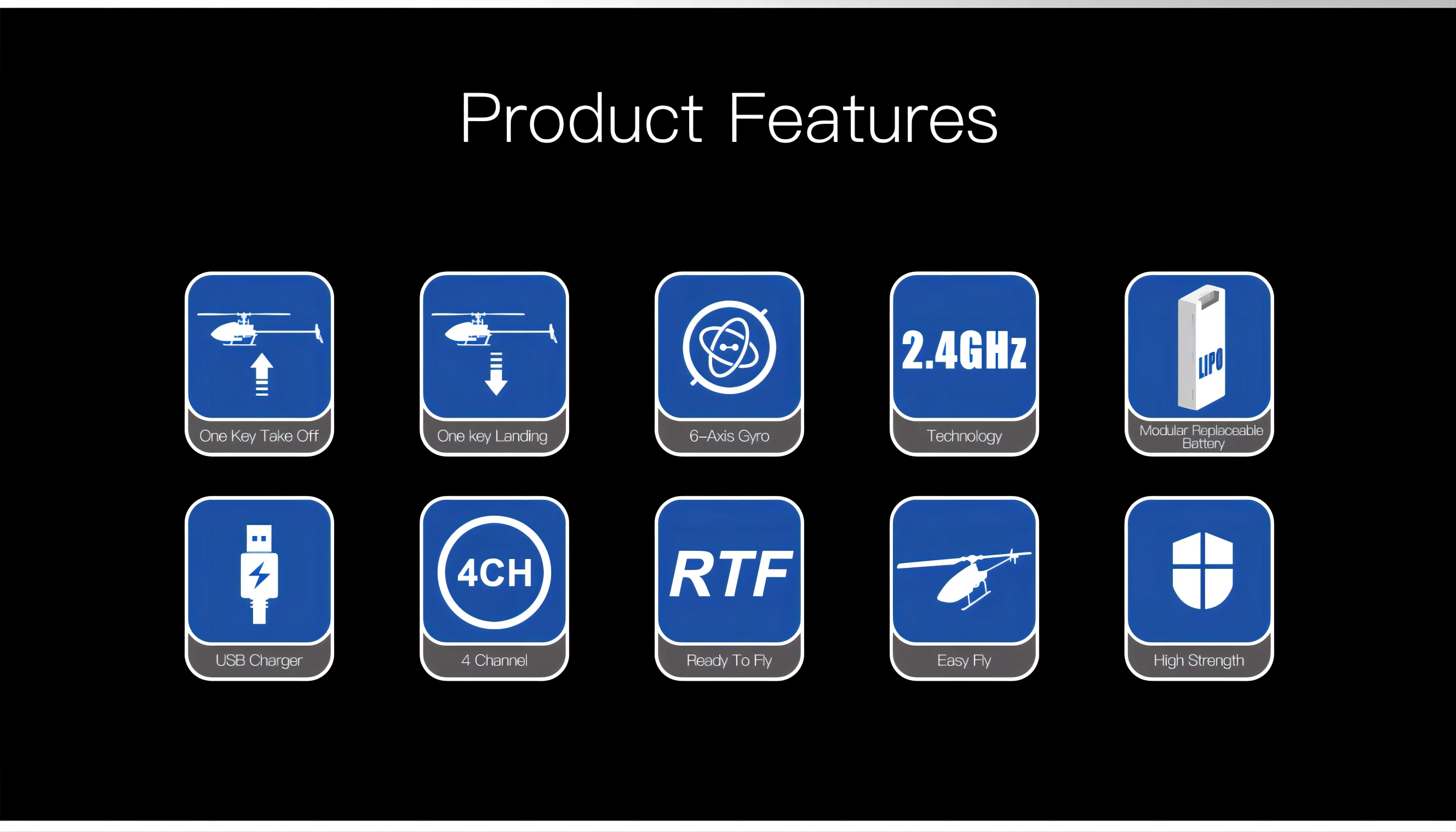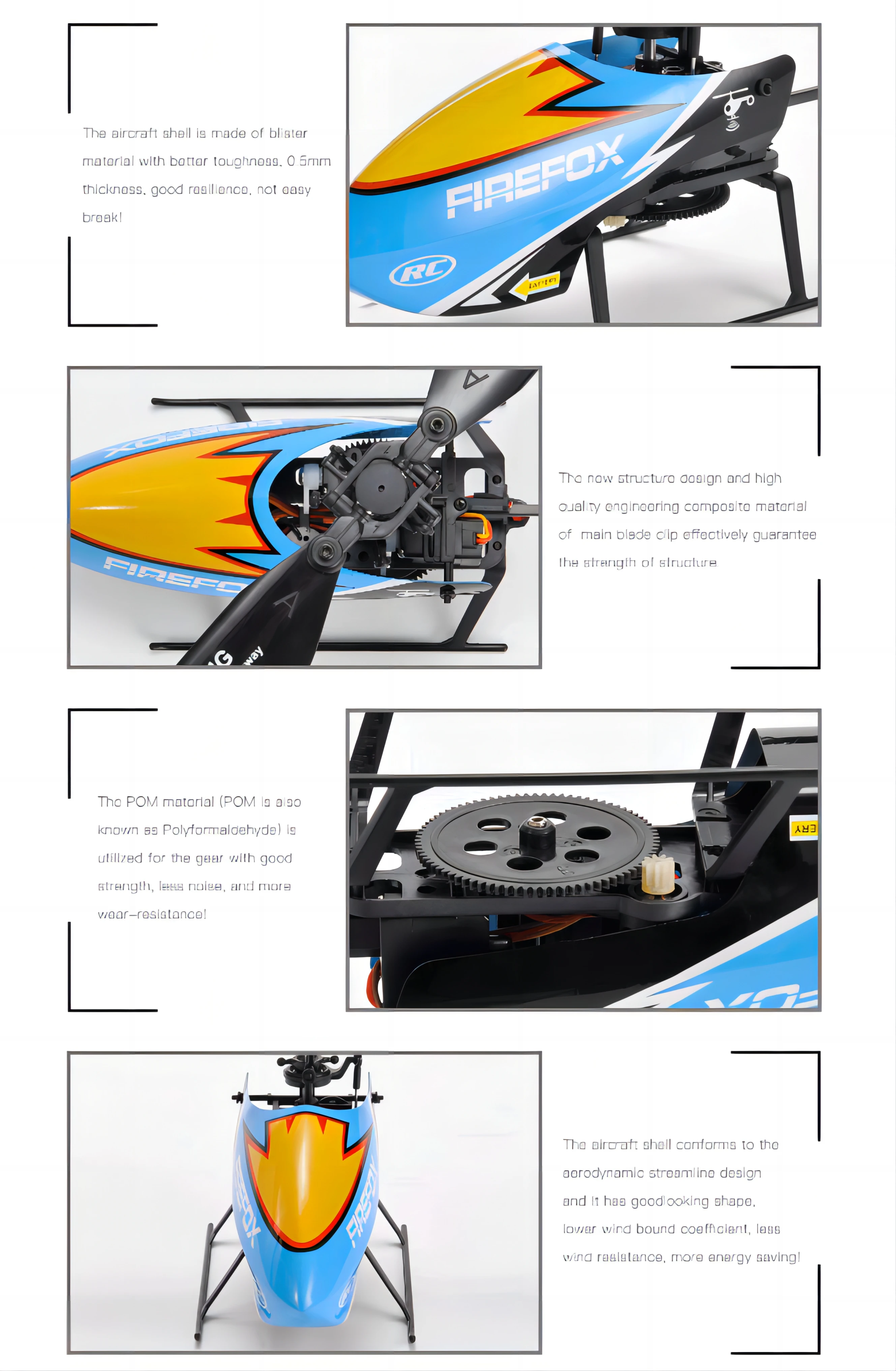 6 4 channel remote control, low voltage alarm, blocked rotor protection, out of control protection, size rudder quantity conversion, one key take-off, one key landing