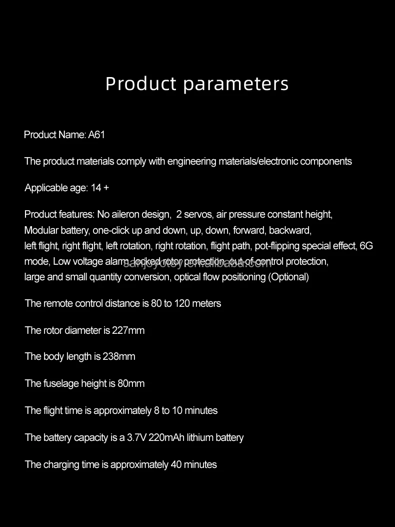 | Product size | The rotor diameter is 227mm and the fuselage length is 242mm Width: 67mm, height: 77mm |