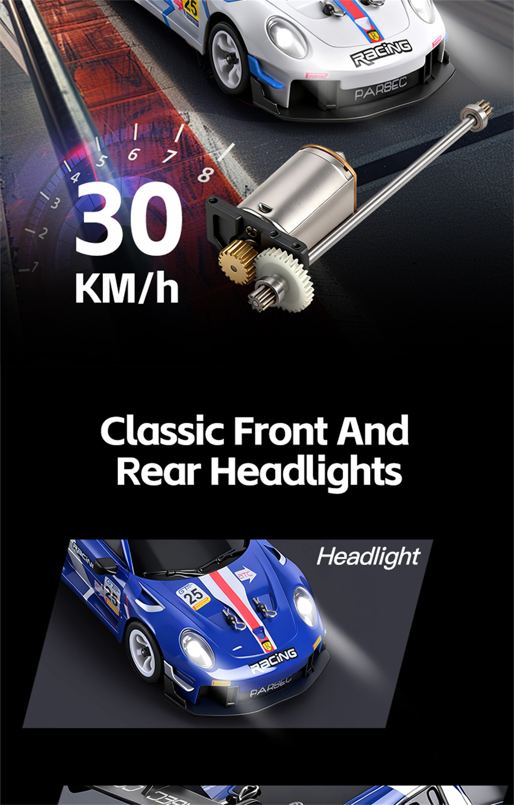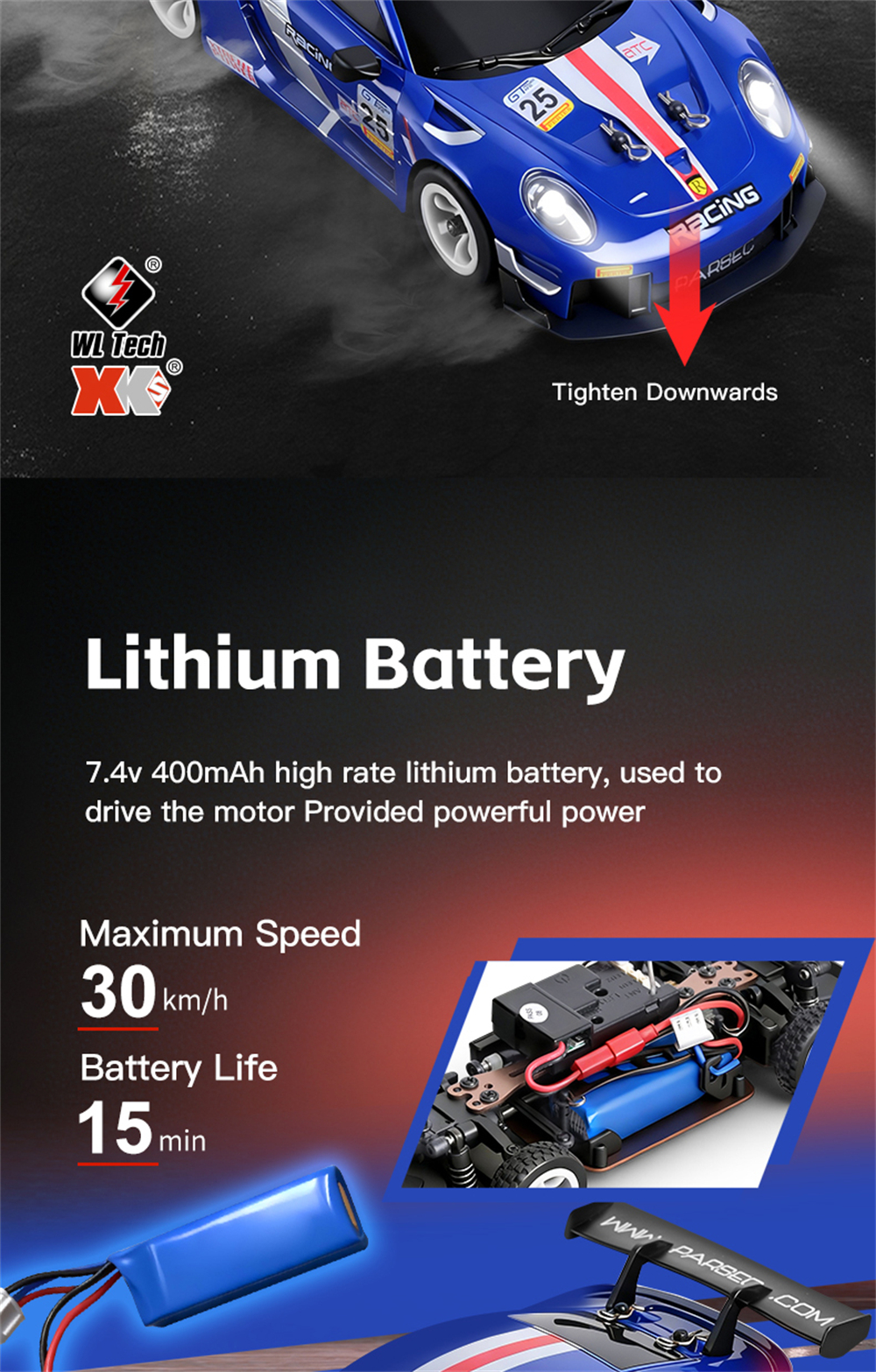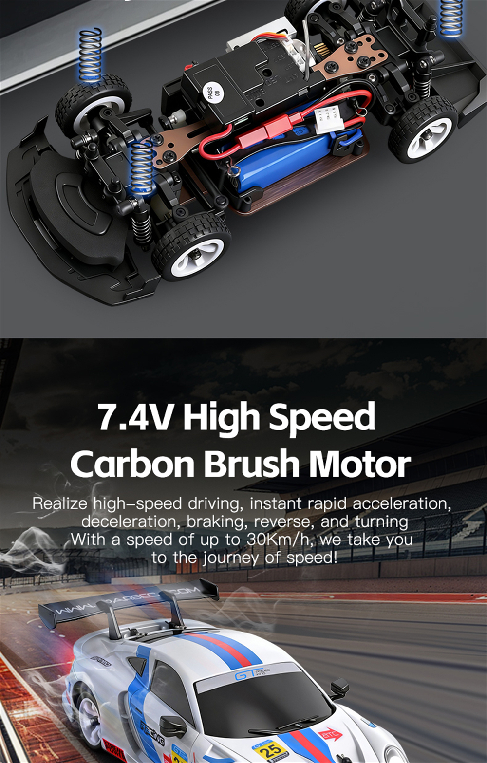 – Top speed of 30km/h with 130 brushed motor.