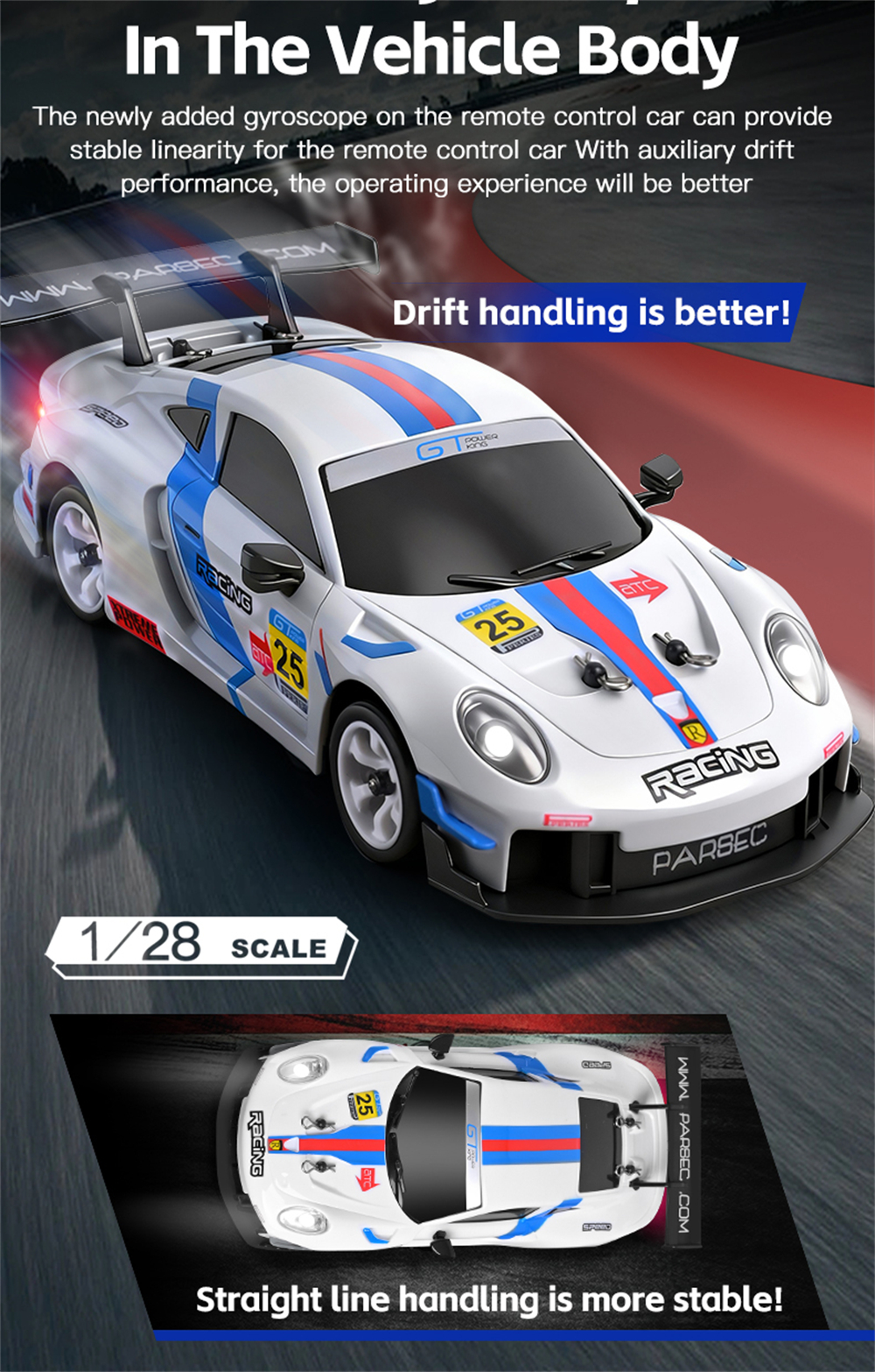 – Built-in gyroscope for straight-line stability and drift assist.