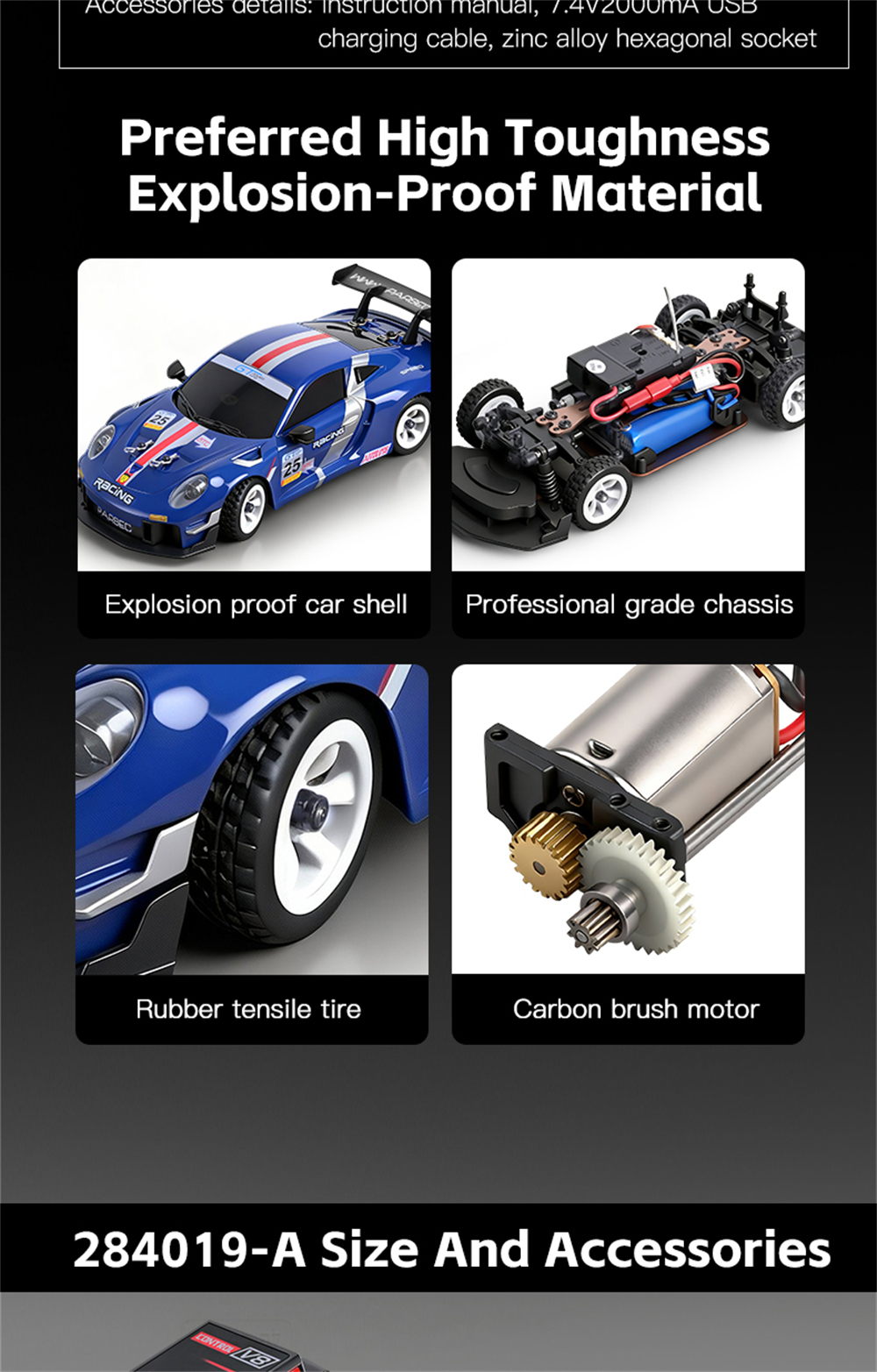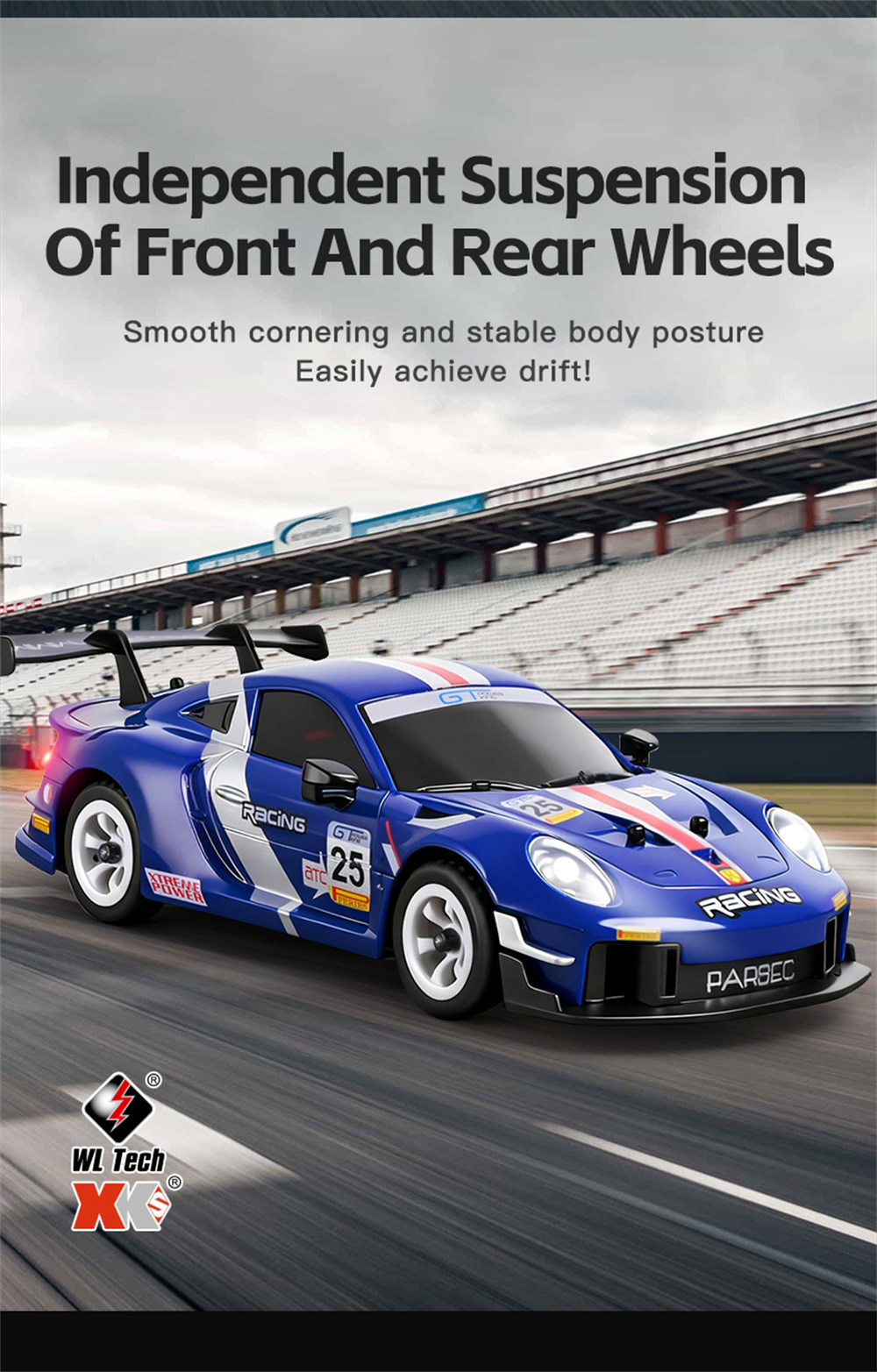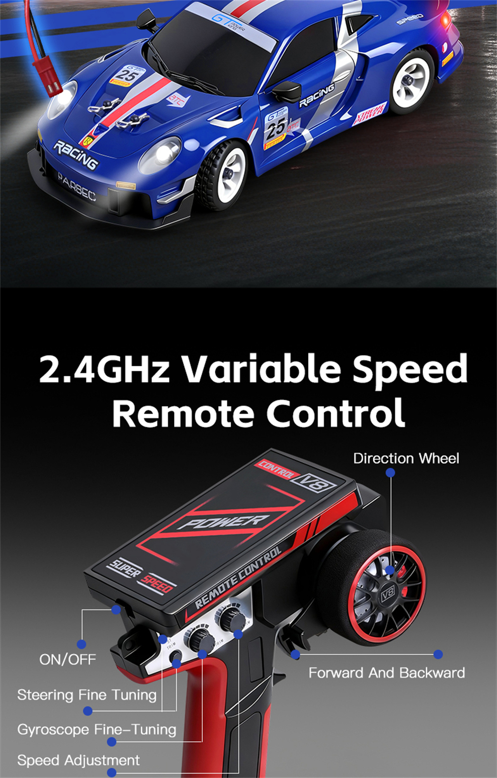 – 2.4GHz Remote Control with 100m range, adjustable trim and dual-rate steering.